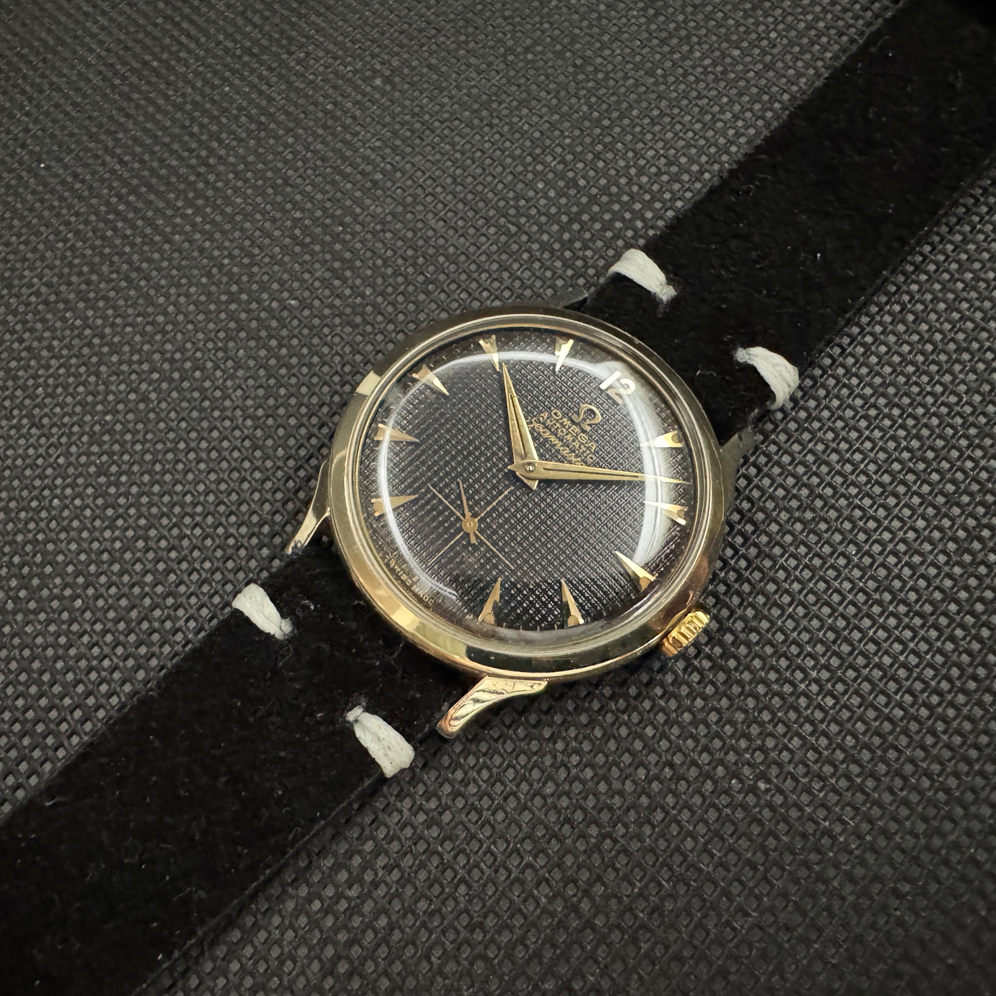 52年製造のオメガ・シーマスターです。ダイアルはギョーシェのブラックダイアルにクサビインデックスで、大きな劣化、変色は見られません。インデックスの夜光は変色しています。