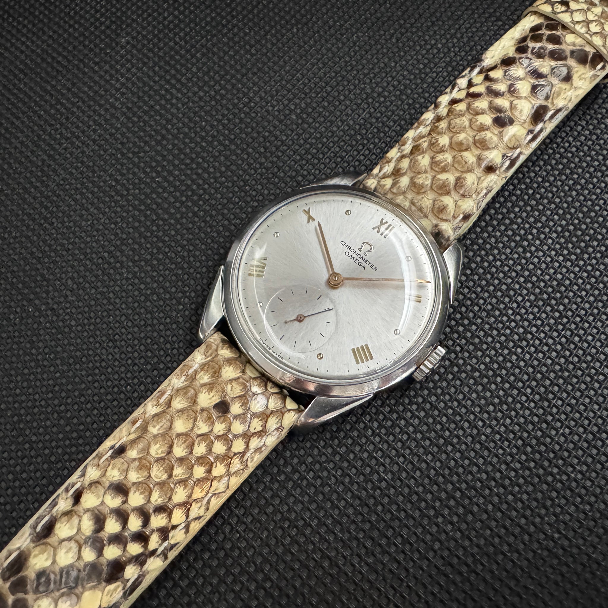 内部ムーブメントはCal.267で、弊社にてオーバーホール済みです。ケースは洗浄のみ行いました。ストラップは委託の際に付いていたパイソンを付けてありますが、ご希望のカラーに交換しての販売もいたします。尾錠はオメガオリジナルです。